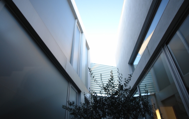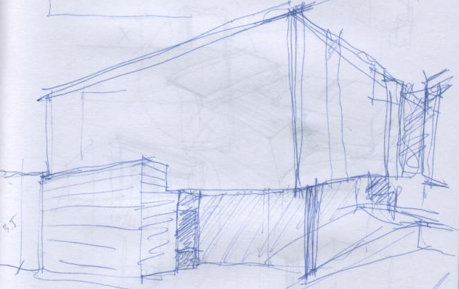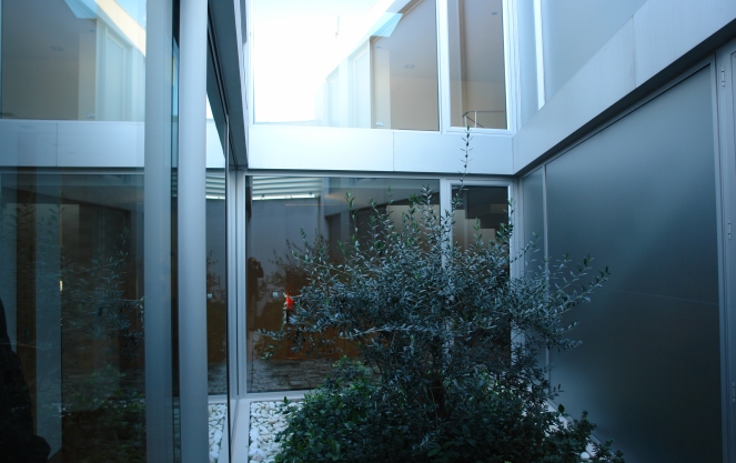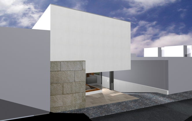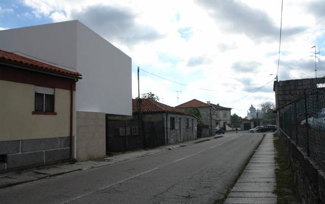 A proposta apresentada, define para cada função volumes distintos, separados, ou unidos, através de um pátio triangular. O pátio permite funcionar como ‘rótula ‘ entre o volume da farmácia e o volume da habitação, mas também possibilita a entrada de iluminação e ventilação natural no interior de ambos os espaços.