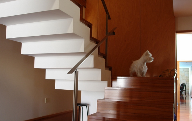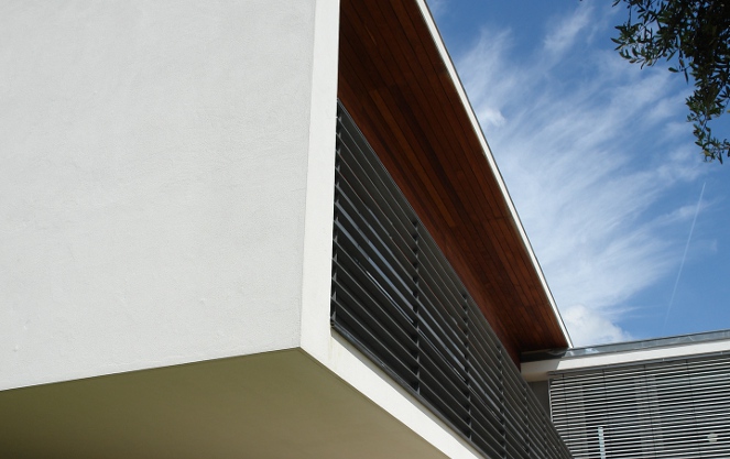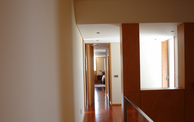 O eixo paralelo à entrada é marcado por um volume branco, completamente cego para quem chega ao terreno. Assume-se como um volume pesado, opaco, horizontal, que obriga quem entra a passar sob o seu ‘peso’ para entrar para a zona interior. O outro eixo define o enquadramento visual a privilegiar e segundo o mesmo desenvolve-se o noutro ‘braço’ da casa. Um volume vertical de madeira, como um grande armário, marca a entrada na casa.