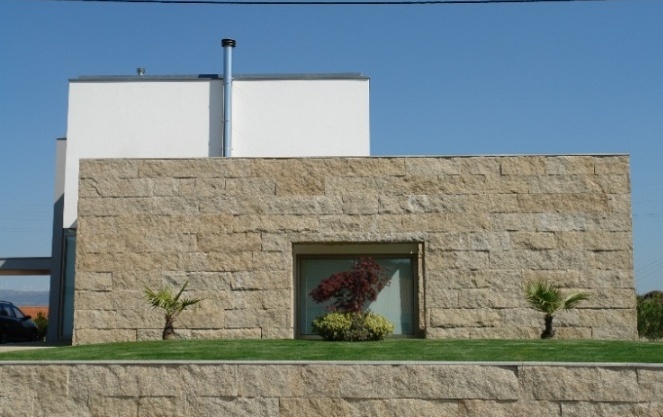 A casa organiza-se à custa de três elementos – corpo social e de serviços (embasamento), corpo suspenso (volume ‘suspenso’) e muro de granito.