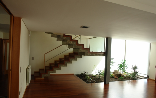 A verticalidade das ligações interiores, acentuadas no átrio de entrada e jardim interior\escada, são apontamentos de mudança de escala que pretendem, não só, unificar o interior da habitação, como referenciar no interior aspectos de escala relacionados com o exterior – a entrada do lote e as montanhas a sul.