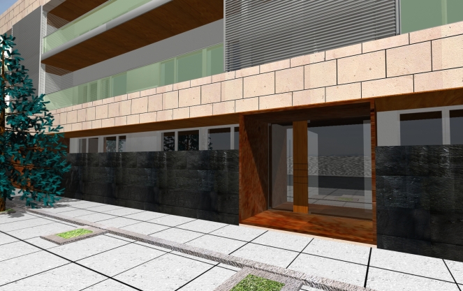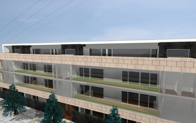 A proposta inicia-se pela resolução do desenho urbano de uma parcela de terreno. O mesmo baseia-se na topografia para implantar duas bandas de edifícios de habitação colectiva, com um atravessamento pedonal de toda a parcela com a orientação de um arruamento existente a norte.