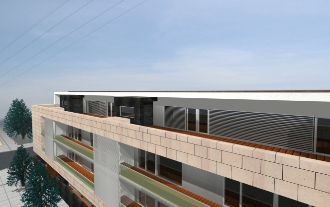 Nos topos do edifício valoriza-se o desenho unitário da sua ‘face’. Nos mesmos, torna-se clara a separação entre o volume rugoso e o volume polido, separados por uma linha de janelas verticais que funciona como uma alheta entre dois materiais.